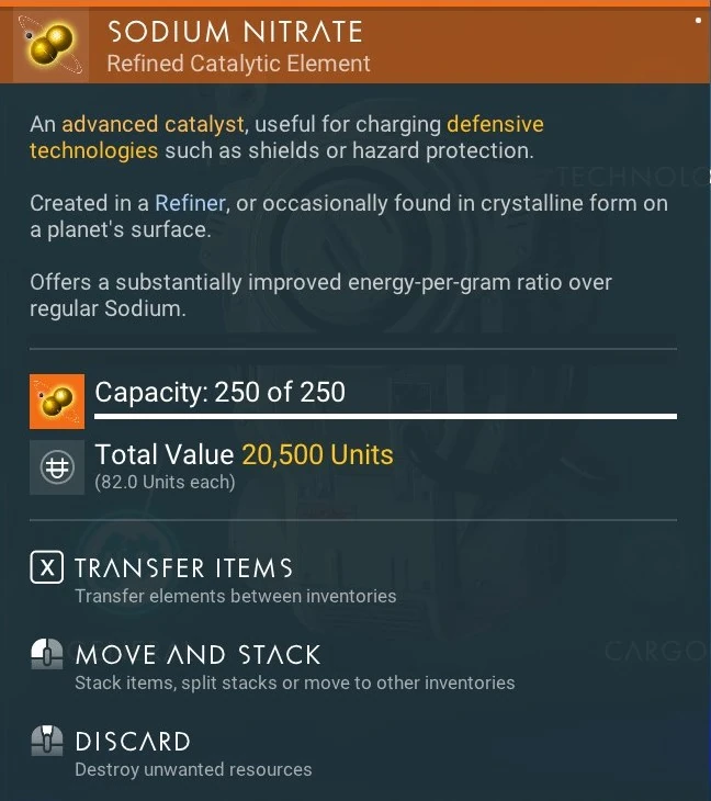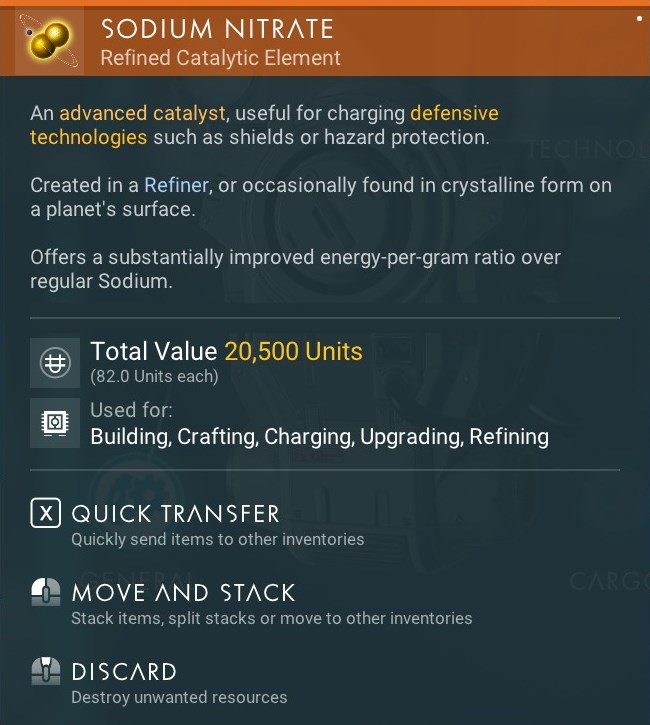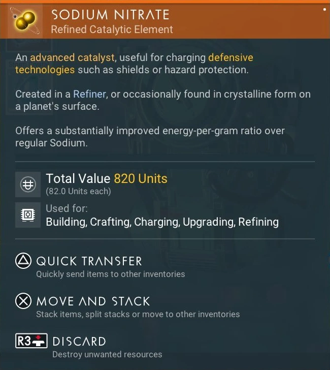 - Sodium Nitrate is roughly 2.5 times more efficient at recharging technologies than Sodium. Therefore, refining Sodium into Sodium Nitrate, despite reducing the quantity at a 2:1 rate, effectively boosts your catalyst reserves by 50%.