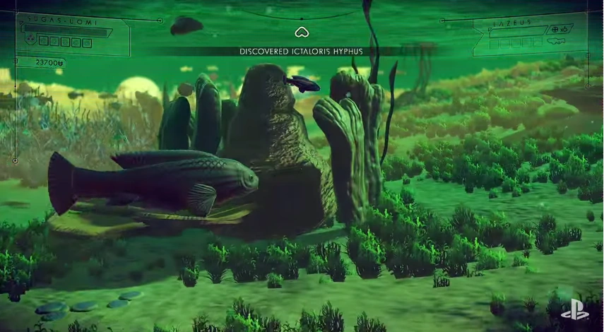 Sugas-Uomi is home to many species of quadrupeds including Bos Curvicus, as well as various types of sea-life. Two species of fish were discovered by Sean at E32015: Ictaloris Hyphus, and Ictaloris Alyptil the first being dubbed the 'E3 fish.'