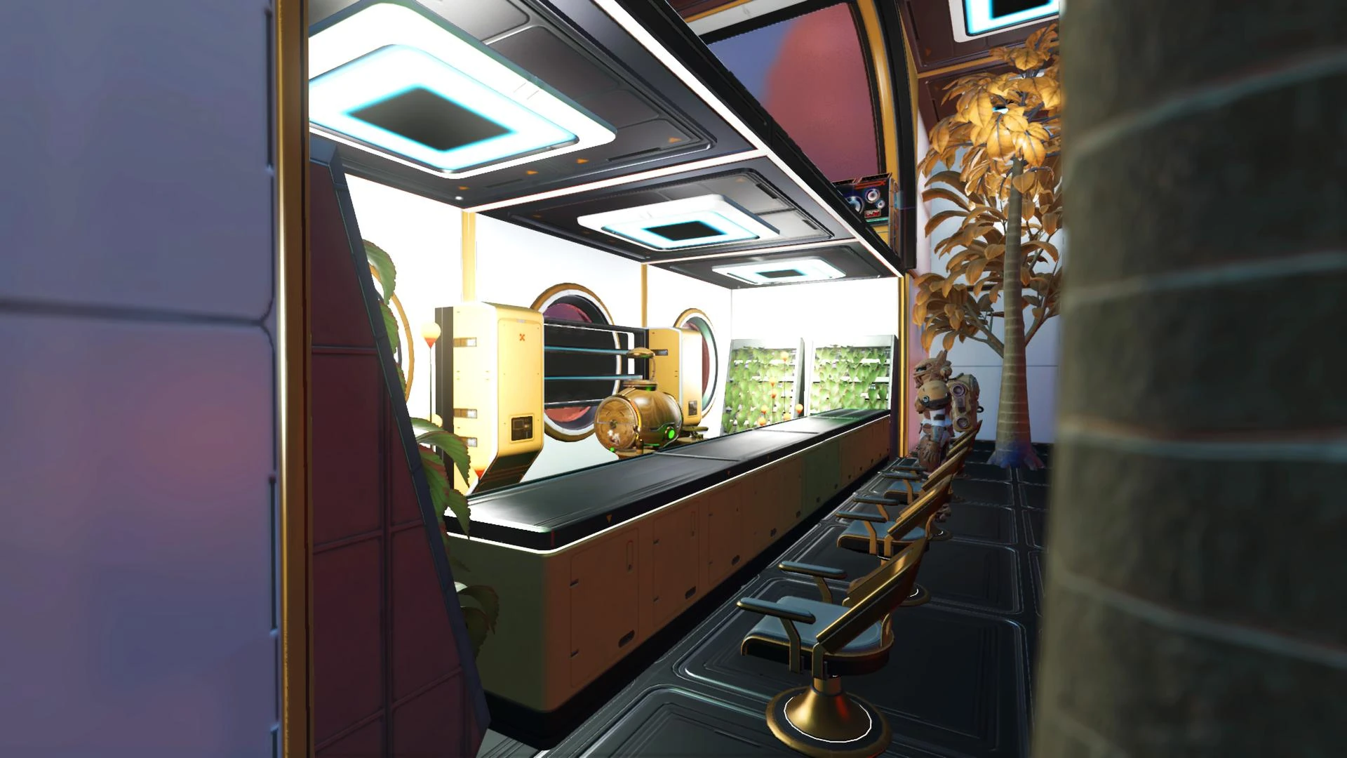 The Q mainly serves as a Cosmic Jazz Club and Lounge, with accommodations for visitors, two Bio-Domes with 16 NipNip Buds each and one with 16 Frostwort plants, two Appearance Modifiers, two Galactic Trade Terminals, a total of 14 Standing Planters, two large Hydroponic Trays of original Qitanian throne room NipNip Buds and a set of eight Bytebeat Devices at the barroom playing the traditional Qitanian tune "Kouth pah yeham'em (Sleeping in the clouds)".