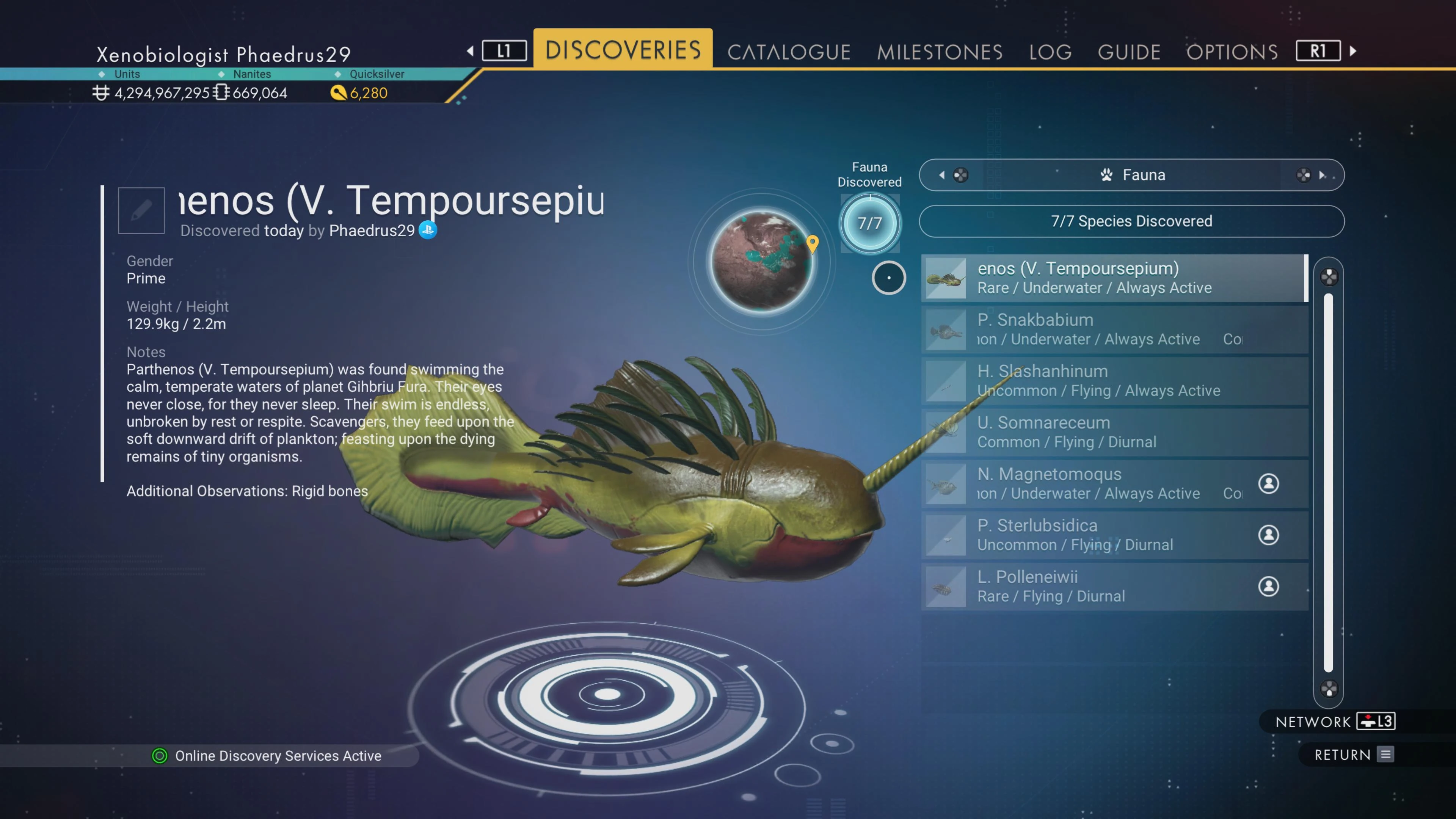 Parthenos (V. Tempoursepium) was found swimming the calm, temperate waters of planet Gihbriu Fura. Their eyes never close, for they never sleep. Their swim is endless, unbroken by rest or respite. Scavengers, they feed upon the soft downward drift of plankton; feasting upon the dying remains of tiny organisms.