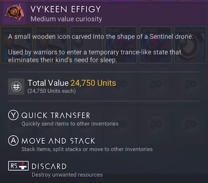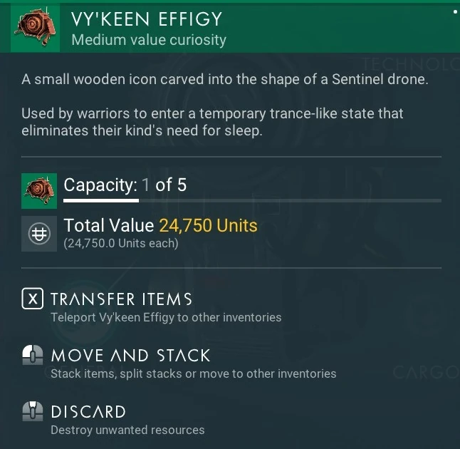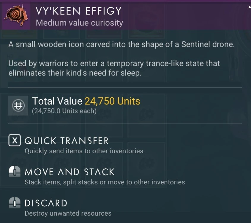 - It can be given to Vy'keen NPCs to increase the player's standing with them.